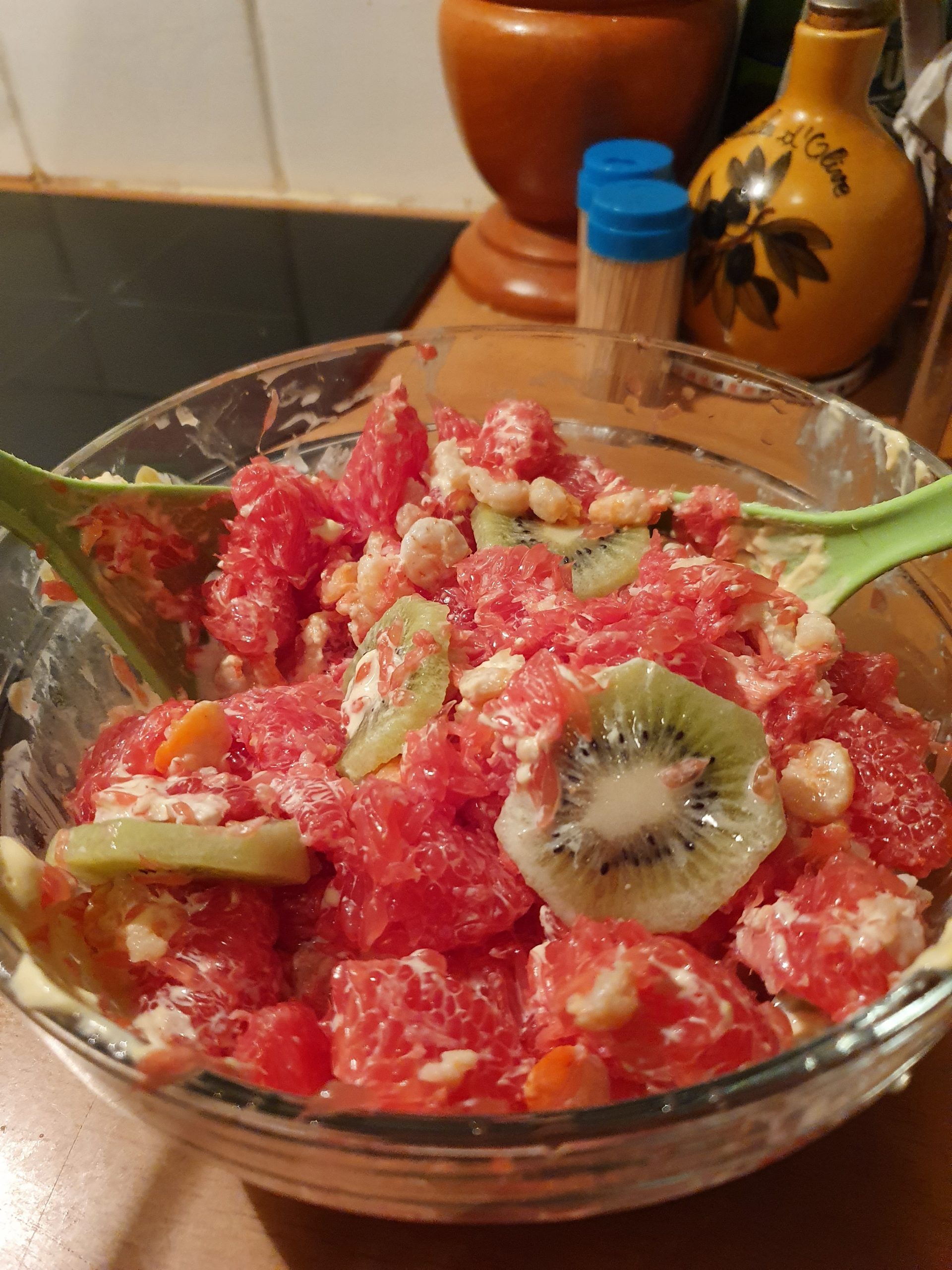 Ingrédients: 3-4 pamplemousses 1 boîte de crevettes 2 avocats 2 kiwis mayonnaise Préparation: dans un grand saladier, détacher la chair des pamplemousses à l’aide d’un couteau à agrumes ou d’une petite cuiller Y verser...